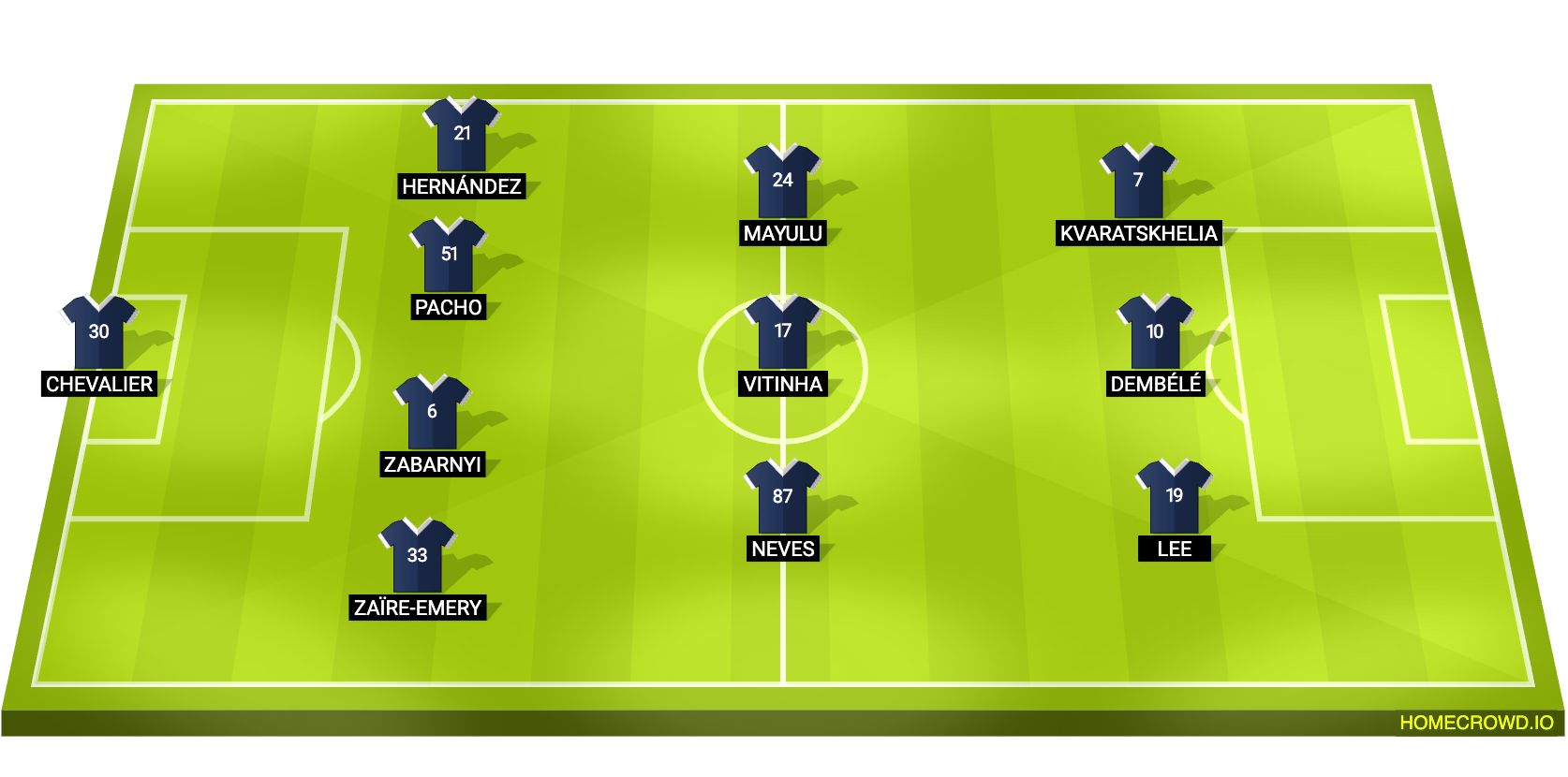 Probable Lineup (4-3-3): Chevalier; Zaire-Emery, Zabarnyi, Pacho, Hernandez; Neves, Vitinha, Mayulu; Kang-in, Dembele, Kvaratskhelia