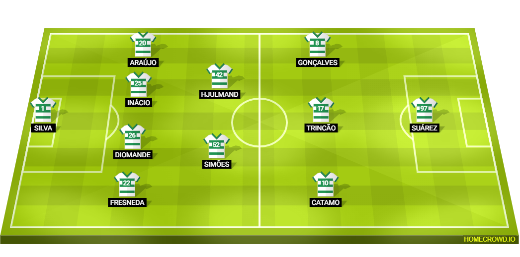Probable Lineup (4-2-3-1): Silva; Fresneda, Diomande, Inacio, Araujo; Simoes, Hjulmand; Catamo, Trincao, Goncalves; Suarez