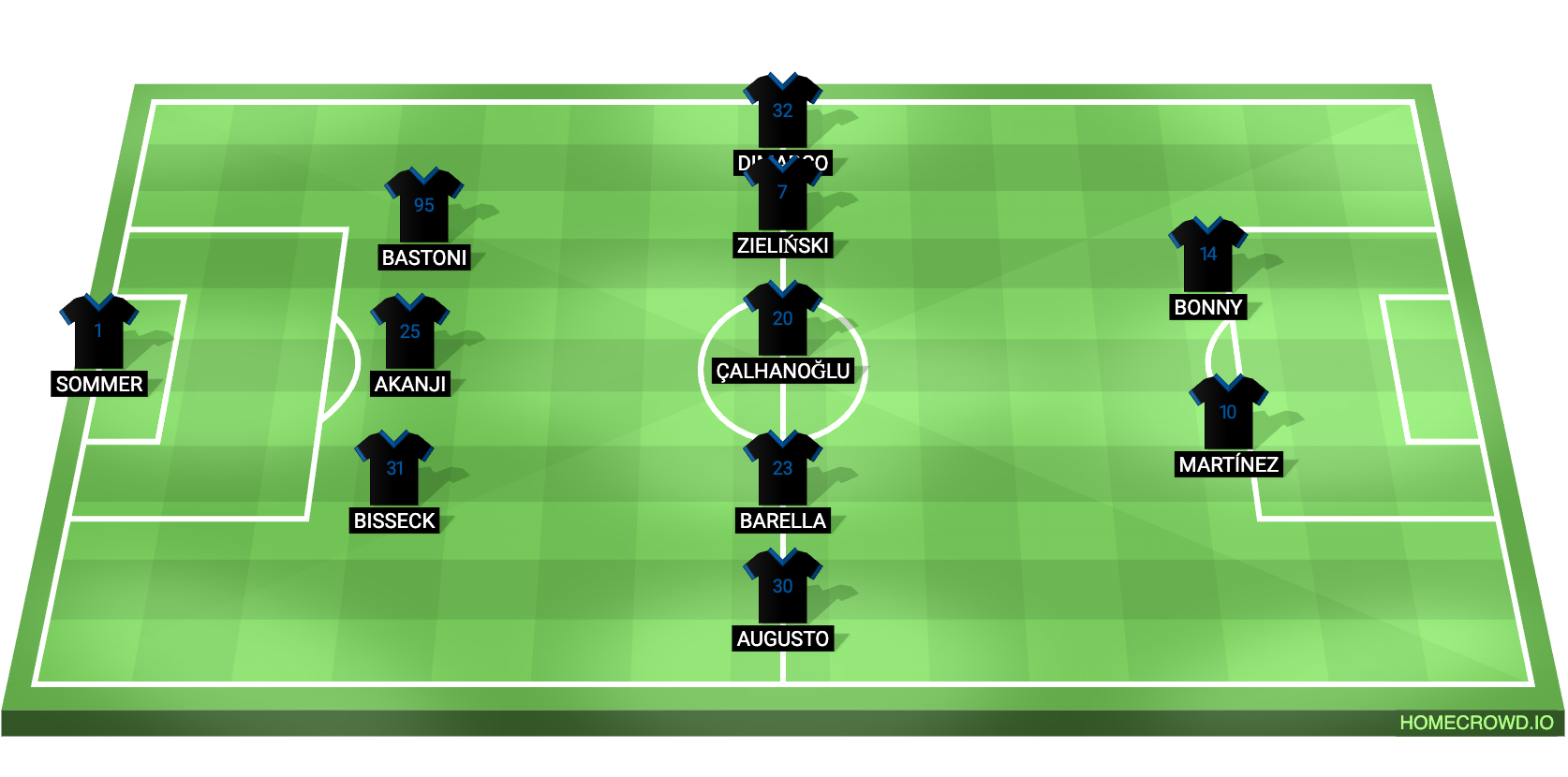 As for the midfield unit, Hakan Calhanoglu will add creativity to the side alongside Nicolo Barella and Piotr Zielinski in the middle of the park. They will add control and composure. Up front, captain Lautaro Martinez will start alongside Ange-Yoan Bonny.