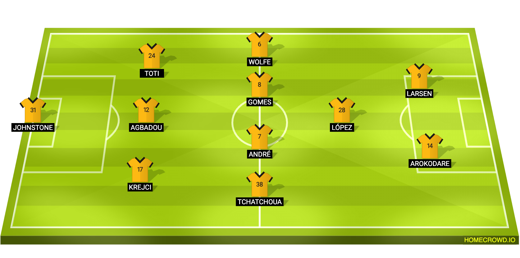 Probable Lineup (3-4-1-2): Johnstone; Krejci, Agbadou, Toti; Tchatchoua, Gomes, Andre, Wolfe; Lopez; Arokodare, Strand Larsen