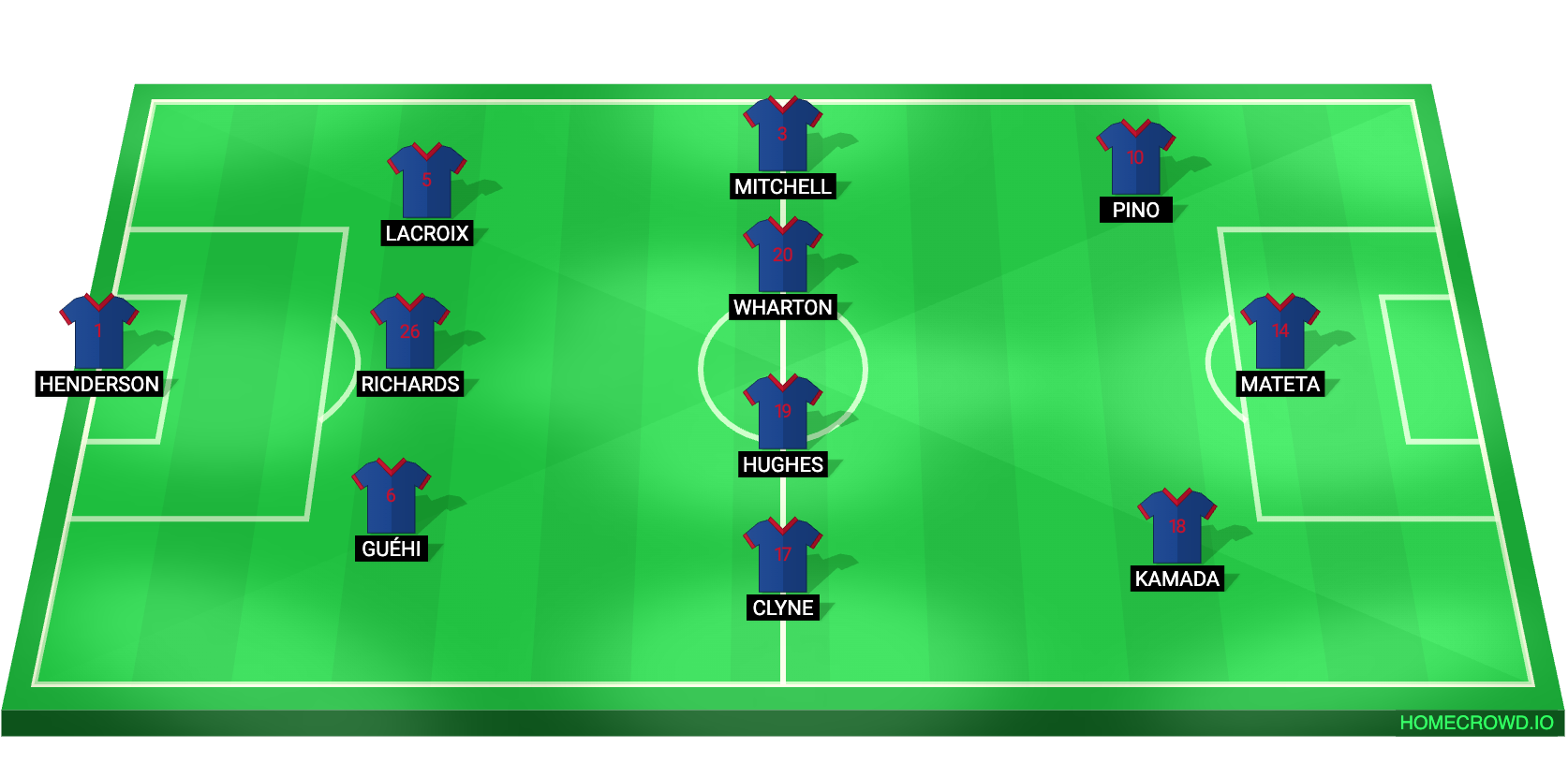 Probable Lineup (3-4-2-1): Henderson; Guehi, Lacroix, Richards; Clyne, Hughes, Wharton, Mitchell; Kamada, Pino; Mateta