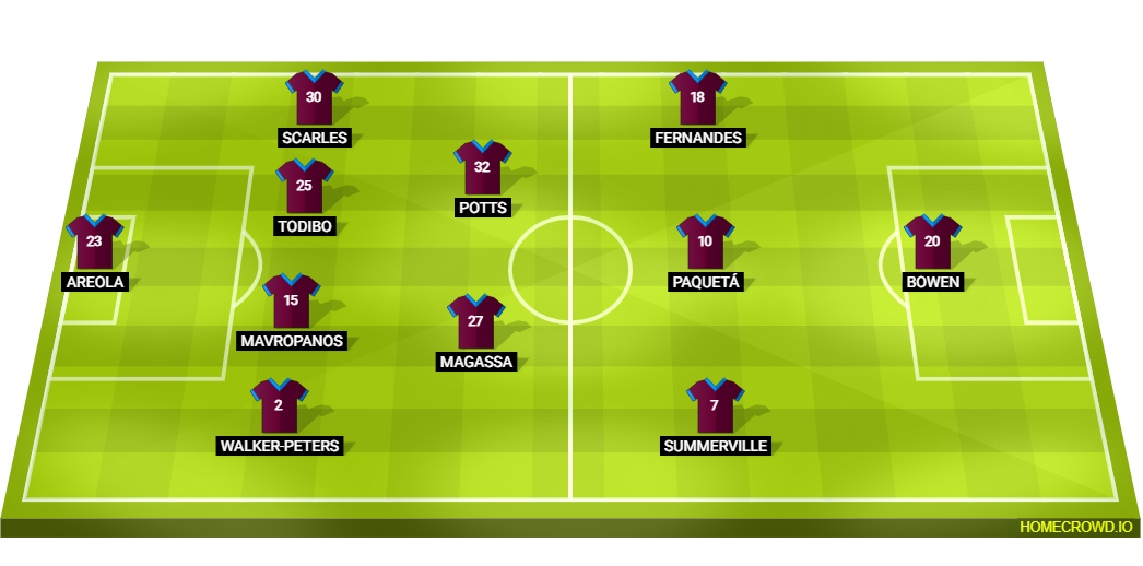 Probable Lineup (4-2-3-1): Areola; Walker-Peters, Mavropanos, Todibo, Scarles; Magassa, Potts; Summerville, Paqueta, Fernandes; Bowen