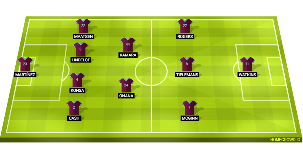 Probable Lineup (4-2-3-1): Martinez; Cash, Konsa, Lindelof, Maatsen; Onana, Kamara; McGinn, Tielemans, Rogers; Watkins