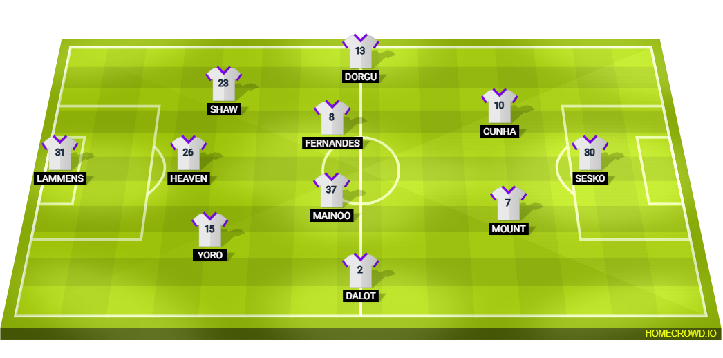 Probable Lineup (3-4-2-1): Lammens; Yoro, Heaven, Shaw; Dalot, Mainoo, Bruno Fernandes, Dorgu; Mount, Cunha; Sesko