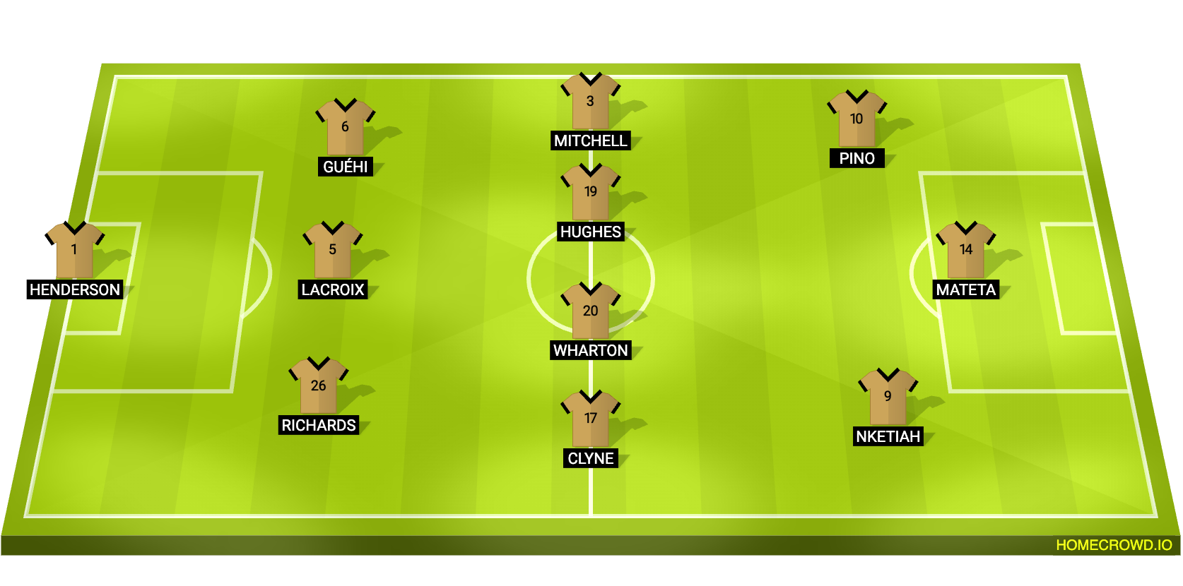 Probable Lineup (3-4-2-1): Henderson; Richards, Lacroix, Guehi; Clyne, Wharton, Hughes, Mitchell; Nketiah, Pino; Mateta