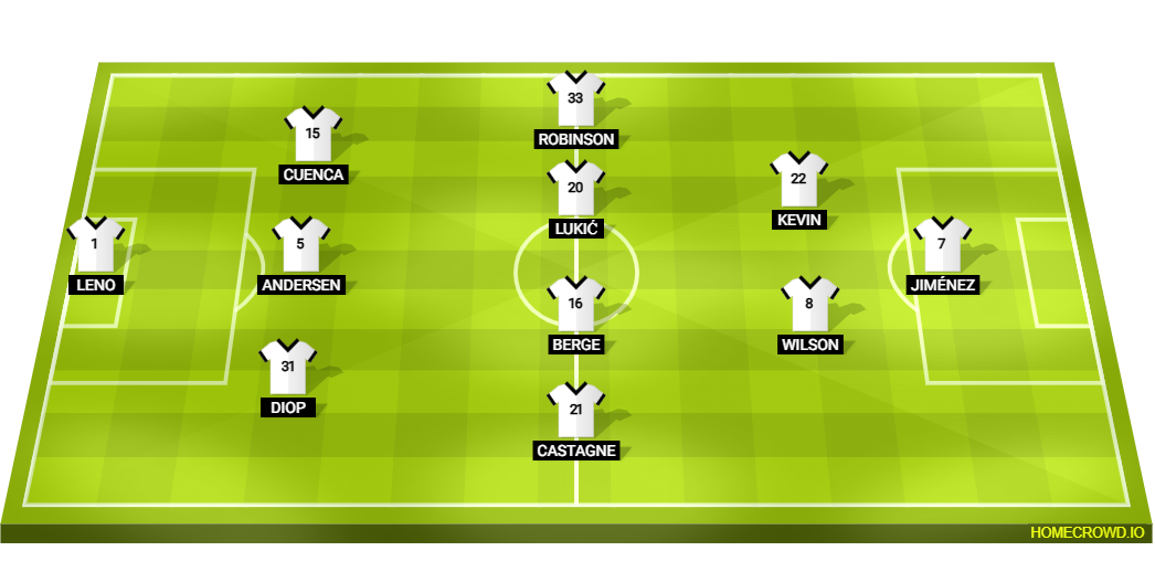 Probable Lineup (3-4-2-1): Leno; Diop, Andersen, Cuenca; Castagne, Berge, Lukic, Robinson; Wilson, Kevin; Jimenez