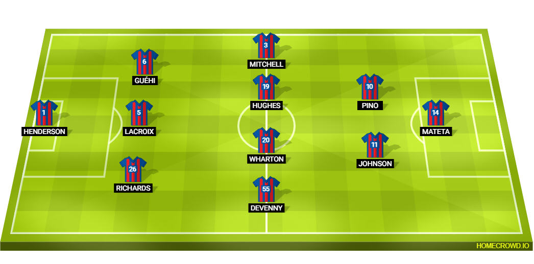 Probable Lineup (3-4-2-1): Henderson; Richards, Lacroix, Guehi; Devenny, Wharton, Hughes, Mitchell; Johnson, Pino; Mateta