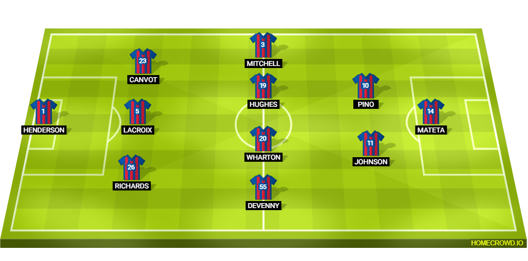 Probable Lineup (3-4-2-1): Henderson; Richards, Lacroix, Guehi; Devenny, Wharton, Hughes, Mitchell; Johnson, Pino; Mateta