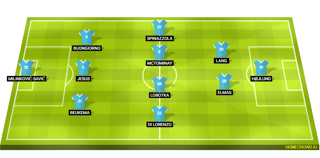 Probable Lineup (3-4-2-1): Milinkovic-Savic; Beukema, Jesus, Buongiorno; Di Lorenzo, Lobotka, McTominay, Spinazzola; Elmas, Lang; Hojlund