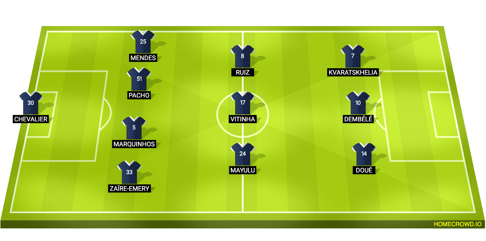 Probable Lineup (4-3-3): Chevalier; Zaire-Emery, Marquinhos, Pacho, Mendes; Mayulu, Vitinha, Ruiz; Doue, Dembele, Kvaratskhelia