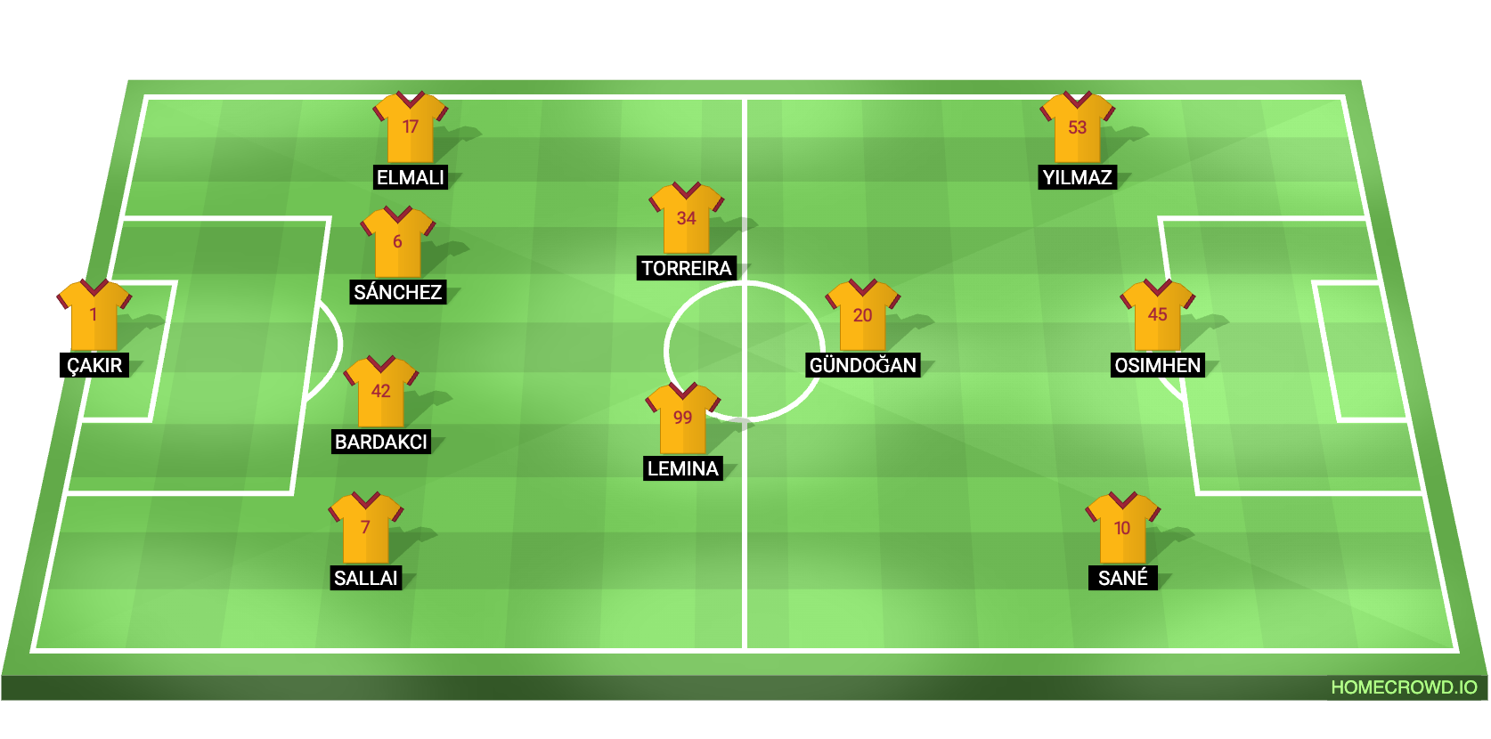 Galatasaray (4-2-3-1): Cakir, Sallai, Sanchez, Bardakci, Elmali; Lemina, Torreira; Sane, Gundogan, Yilmaz; Osimhen