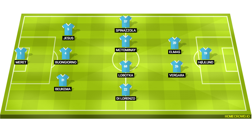 Probable Lineup (3-4-2-1): Meret; Beukema, Buongiorno, Juan Jesus; Di Lorenzo, Lobotka, McTominay, Spinazzola; Vergara, Elmas; Hojlund