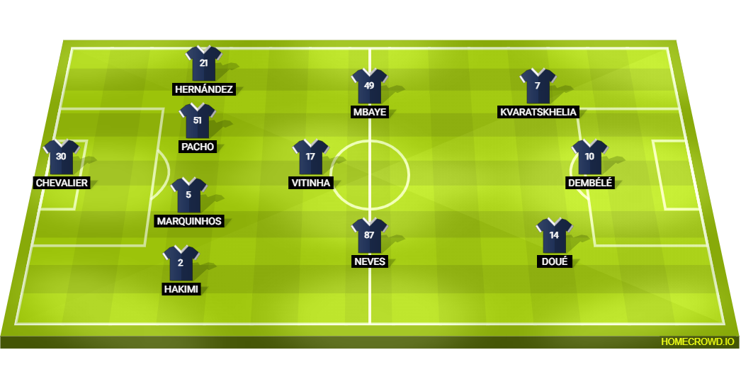 Probable Lineup (4-3-3): Chevalier; Zaire-Emery, Marquinhos, Pacho, Hernandez; Neves, Vitinha, Mbaye; Doue, Dembele, Kvaratskhelia