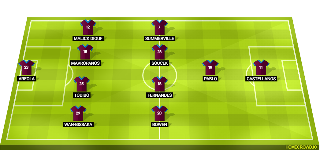 Probable Lineup (4-4-1-1): Areola; Wan-Bissaka, Todibo, Mavropanos, Diouf; Bowen, Fernandes, Soucek, Summerville; Pablo; Castellanos