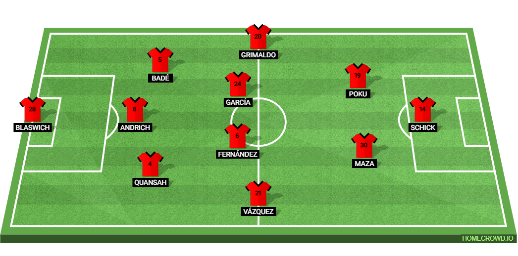 The wing-back roles are likely to be filled by Jonás Vázquez on the right and Alejandro Grimaldo on the left, providing width, progression, and delivery into the final third. In central midfield, Ezequiel Fernandez is expected to offer ball-winning and structure alongside Aleix García, who will dictate tempo and distribution. Ahead of them, Adam Maza and Kwame Poku should operate as advanced attacking midfielders, drifting between the lines to support the lone striker. Leading the line, Patrik Schick is set to spearhead the attack, providing physical presence, hold-up play, and a consistent goal threat inside the penalty area.