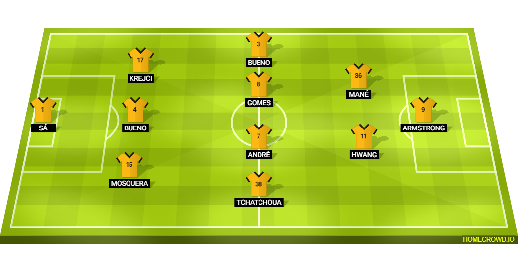 Probable Lineup (3-4-2-1): Sa; Mosquera, Santiago Bueno, Krejci; Tchatchoua, Andre, Joao Gomes, Hugo Bueno; Hwang, Mane; Armstrong