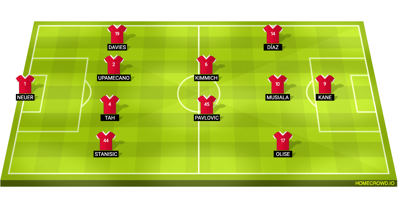 Probable Lineup (4-2-3-1): Neuer; Stanisic, Tah, Upamecano, Davies; Pavlovic, Kimmich; Olise, Musiala, Diaz; Kane