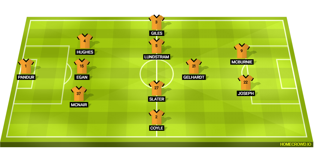 Probable Lineup (3-4-1-2): Pandur; McNair, Egan, Hughes; Coyle, Slater, Lundstram, Giles; Gelhardt; Joseph, McBurnie