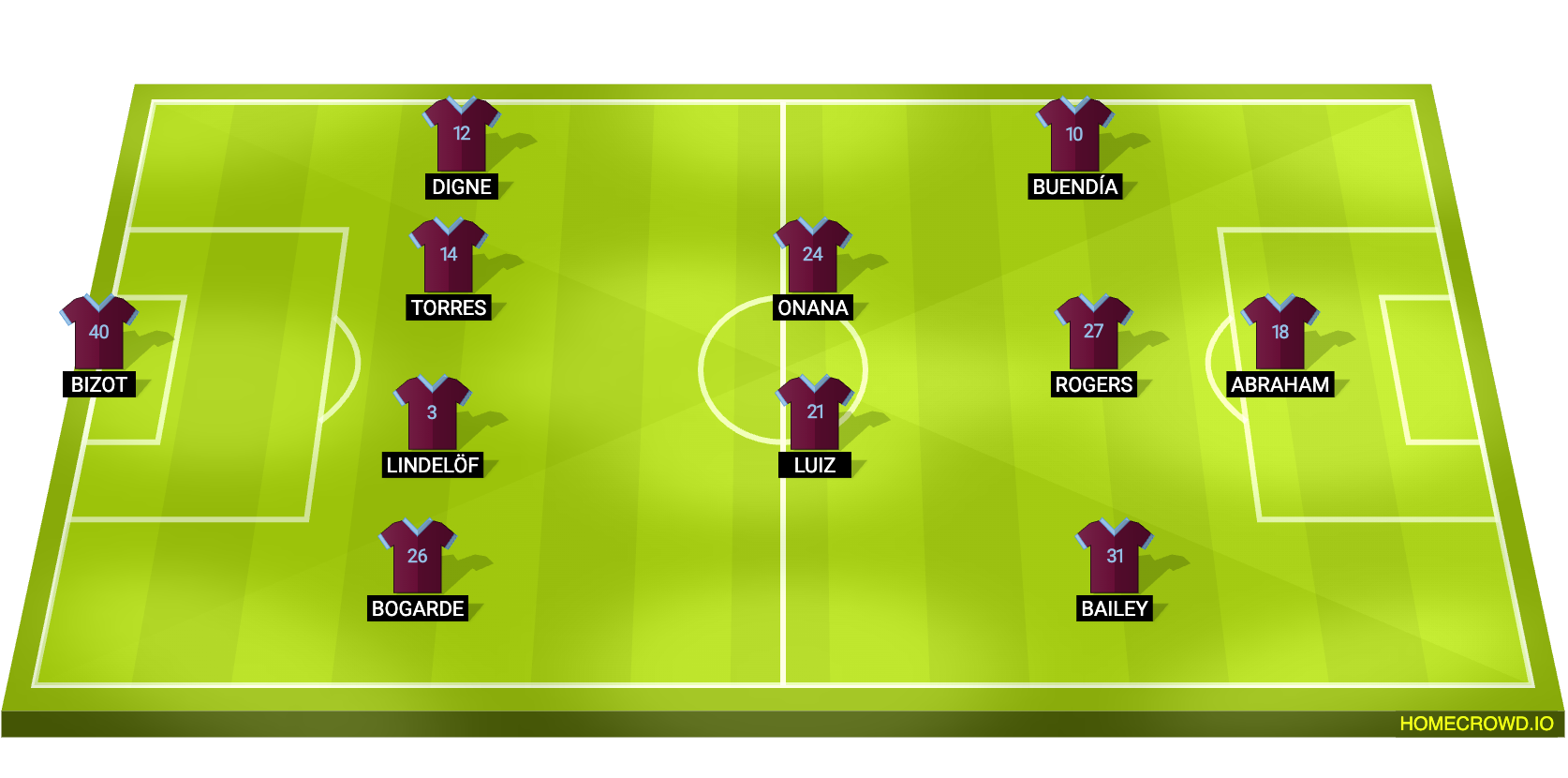 Probable Lineup (4-2-3-1): Bizot; Bogarde, Lindelof, Torres, Digne; Onana, Luiz; Bailey, Rogers, Buendia; Abraham