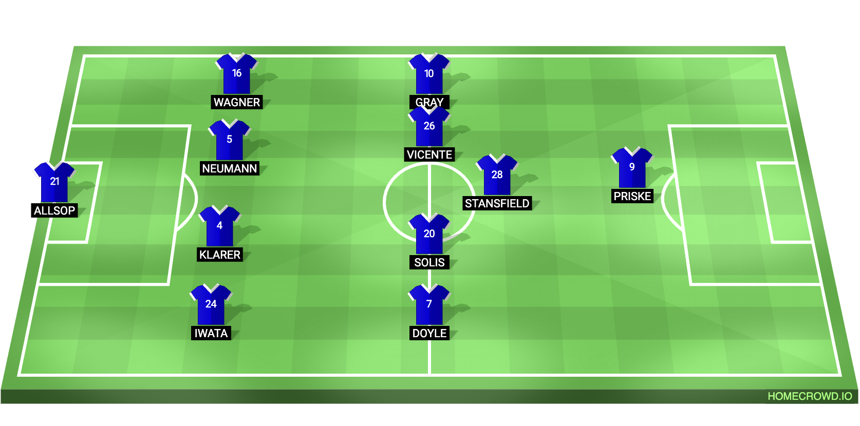 Probable Lineup (4-5-1): Allsop; Iwata, Klarer, Neumann, Wagner; Doyle, Solis, Vicente, Stansfield, Gray; Priske