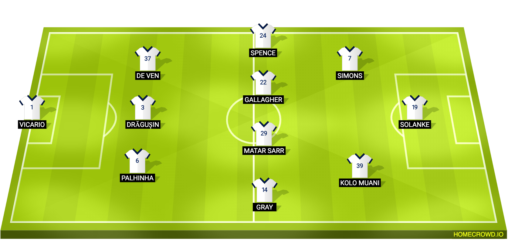 Given the raft of injuries, Tudor is expected to switch to a familiar back three with Joao Palhinha, Radu Dragusin and Micky van de Ven there, with Archie Gray and Djed Spence in the wing-back roles. Pape Matar Sarr and January arrival Conor Gallagher are the midfield pairing for Tudor.
