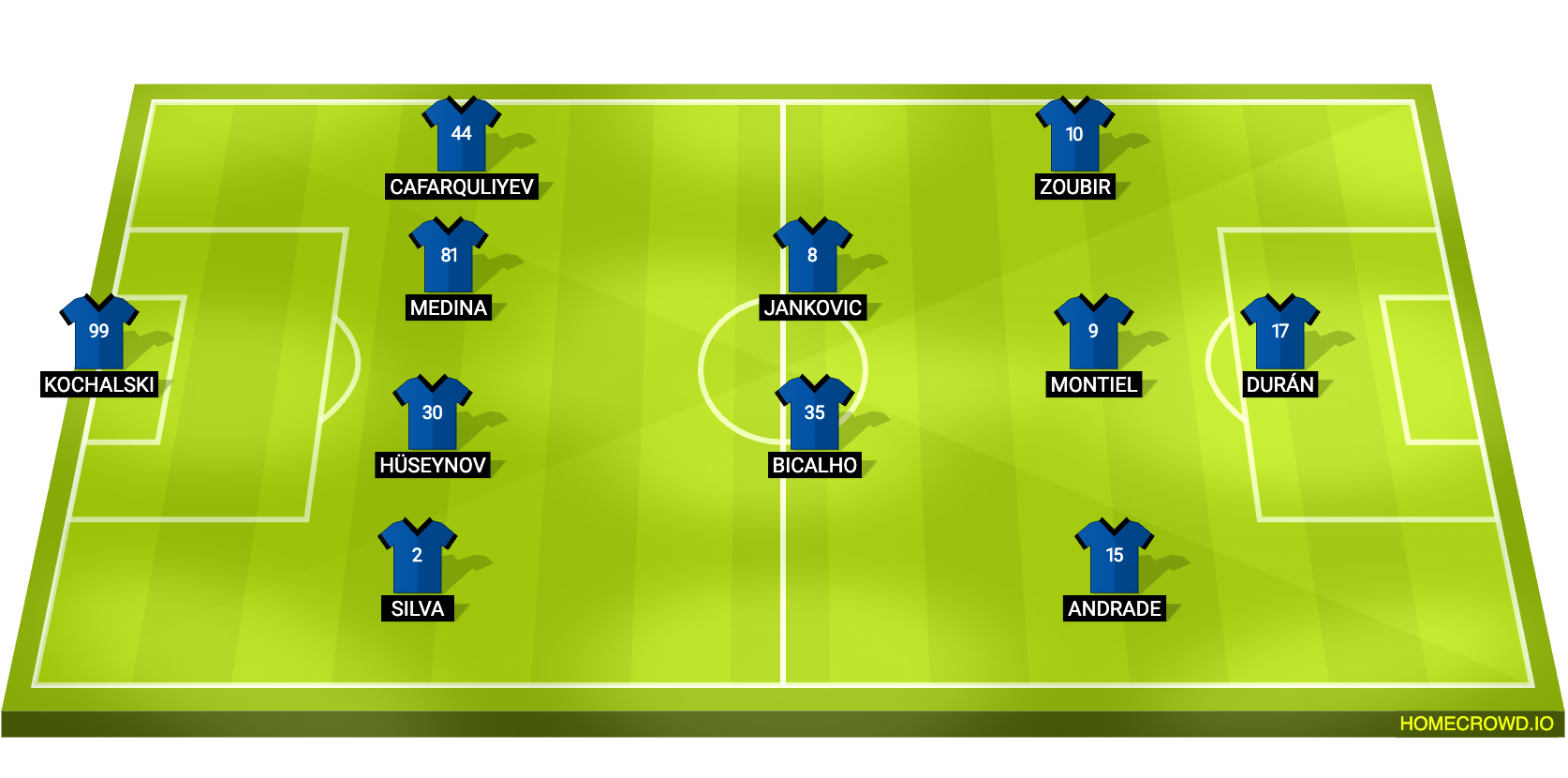 Probable line-up (4-2-3-1): Kochalski; Silva, Huseynov, Medina, Cafarquliyev; Bicalho, Jankovic; Andrade, Montiel, Zoubir; Duran