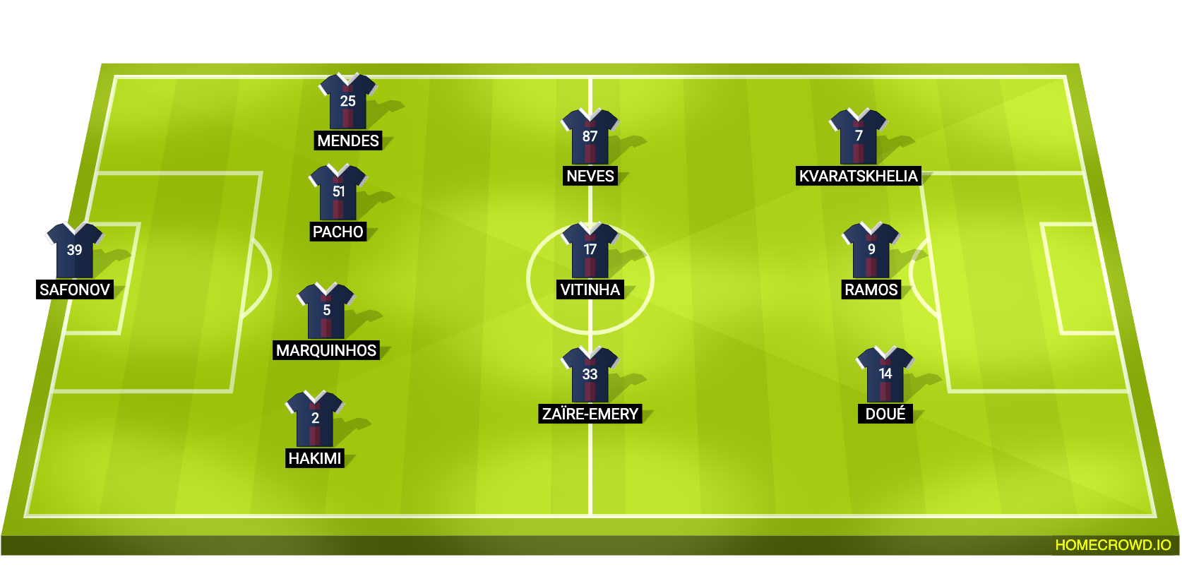 Probable Lineup (4-3-3): Sofanov; Hakimi, Marquinhos, Pacho, Mendes; Zaire-Emery, Vitinha, Neves; Doue, Ramos, Kvaratskhelia
