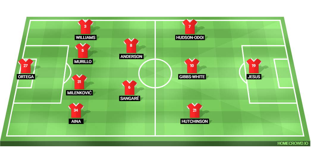Probable Lineup (4-2-3-1): Ortega; Aina, Milenkovic, Murillo, Williams; Sangare, Anderson; Hutchinson, Gibbs-White, Hudson-Odoi; Igor Jesus