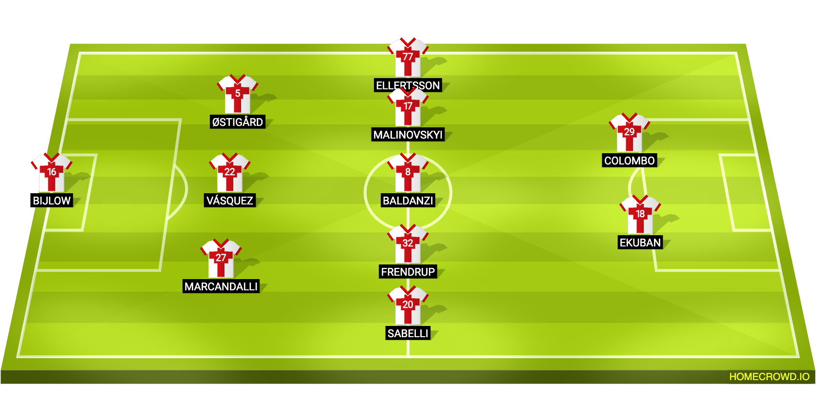 Probable Line-up (3-5-2): Bijlow; Marcandalli, Vasquez, Ostigard; Sabelli, Frendrup, Baldanzi, Malinovskyi, Ellertsson; Ekuban, Colombo