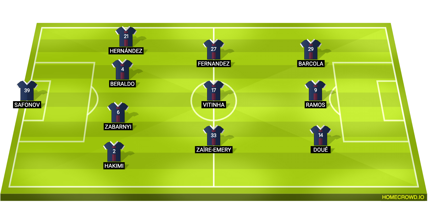Probable Line-up (4-3-3): Safonov; Hakimi, Zabarnyi, Beraldo, Hernandez; Zaire-Emery, Vitinha, Fernández; Doue, Ramos, Barcola
