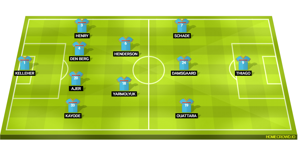 Probable Lineup (4-2-3-1): Kelleher; Kayode, Ajer, van den Berg, Henry; Yarmolyuk, Henderson; Ouattara, Damsgaard, Schade; Igor Thiago