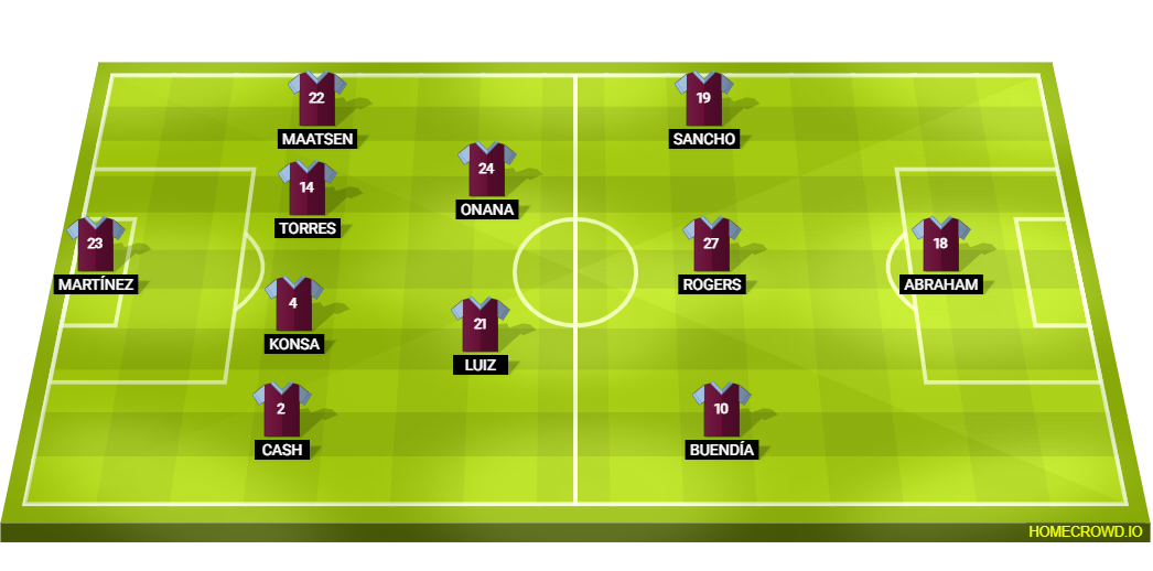 Probable Lineup (4-2-3-1): Martinez; Cash, Konsa, Torres, Maatsen; Luiz, Onana; Buendia, Rogers, Sancho; Abraham
