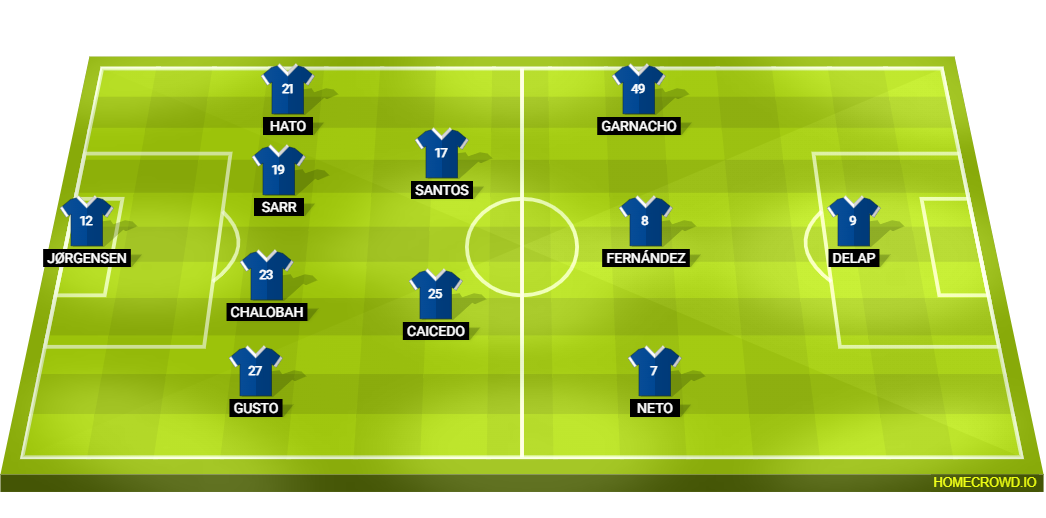 Probable Lineup (4-2-3-1): Jorgensen; Gusto, Chalobah, Sarr, Hato; Caicedo, Santos; Neto, Fernandez, Garnacho; Delap