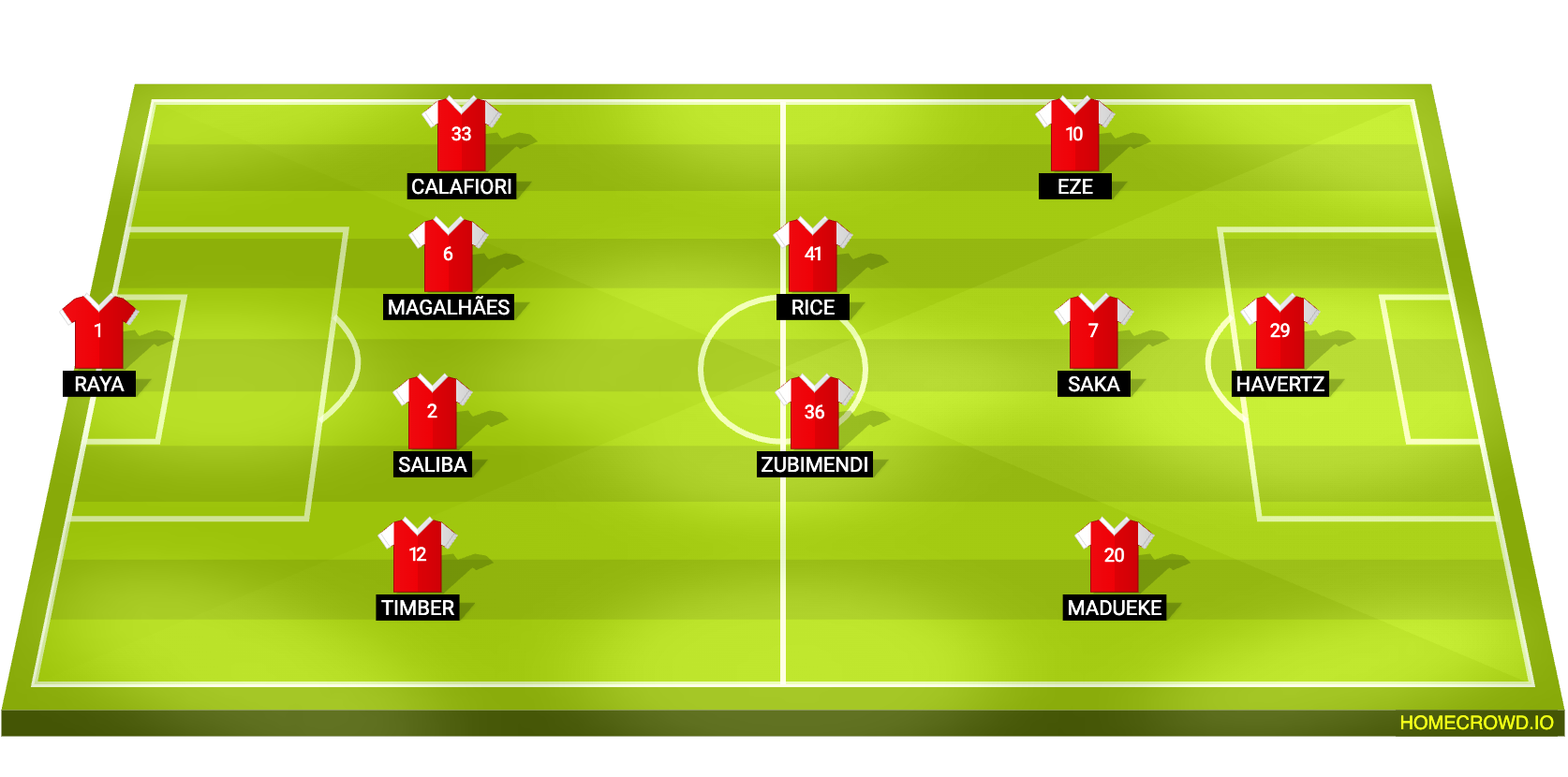 Probable Lineup (4-2-3-1): Raya; Timber, Saliba, Gabriel, Calafiori; Zubimendi, Rice; Madueke, Saka, Eze; Havertz