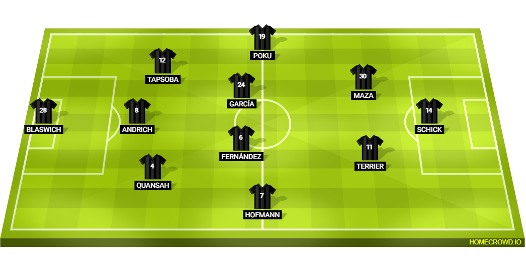 Probable Lineup (3-4-2-1): Blaswich; Quansah, Andrich, Tapsoba; Hofmann, Fernandez, Garcia, Poku; Terrier, Maza; Schick