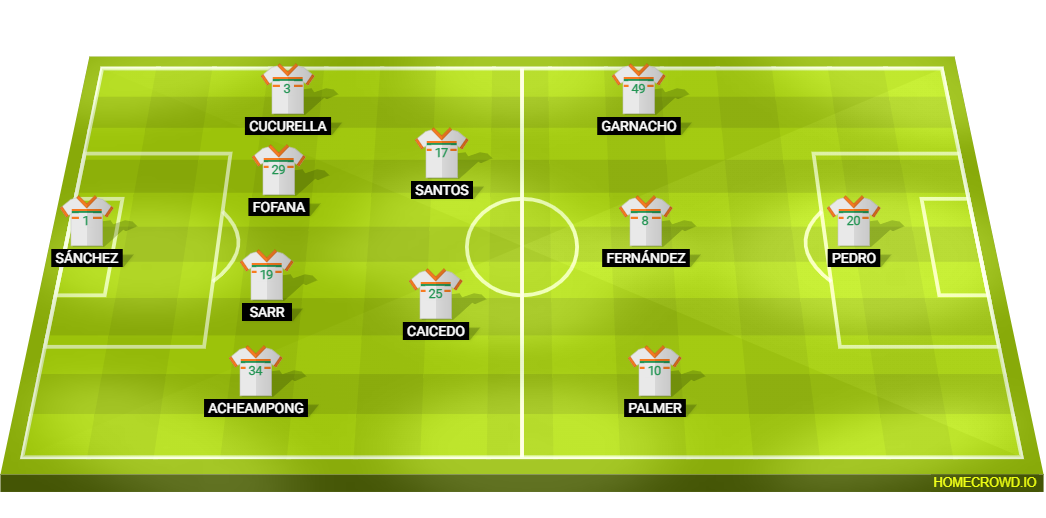 Probable Lineup (4-2-3-1): Sanchez; Acheampong, Sarr, Fofana, Cucurella; Caicedo, Santos; Palmer, Fernandez, Garnacho; Pedro