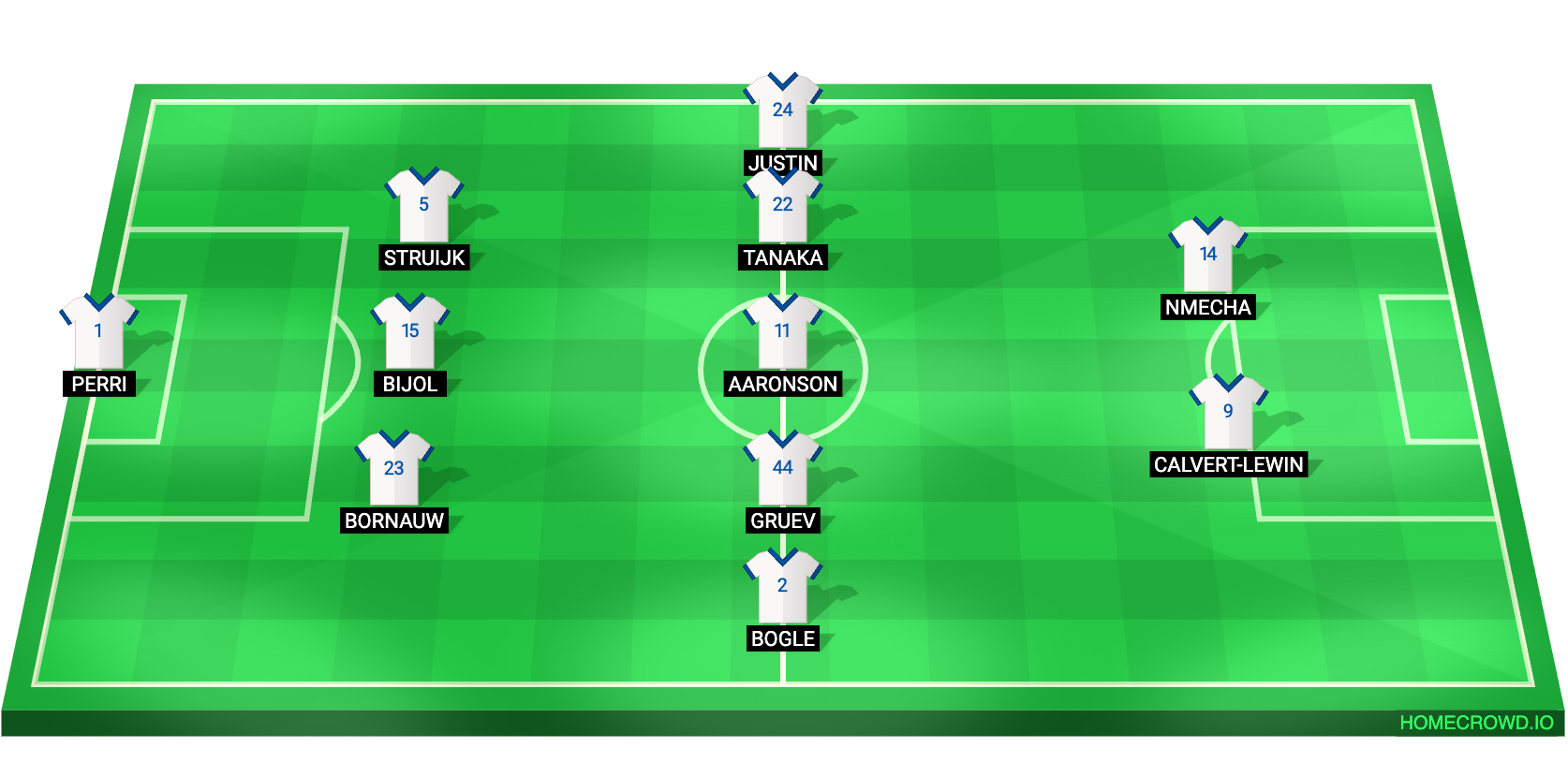 Probable Lineup (3-5-2): Perri; Bornauw, Bijol, Struijk; Bogle, Aaronson, Tanaka, Gruev, Justin; Nmecha, Calvert-Lewin