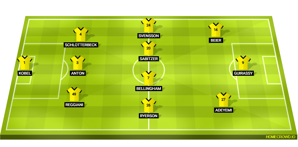 Probable Lineup (3-4-3): Kobel; Reggiani, Anton, Schlotterbeck; Ryerson, Bellingham, Sabitzer, Svensson; Adeyemi, Guirassy, Beier