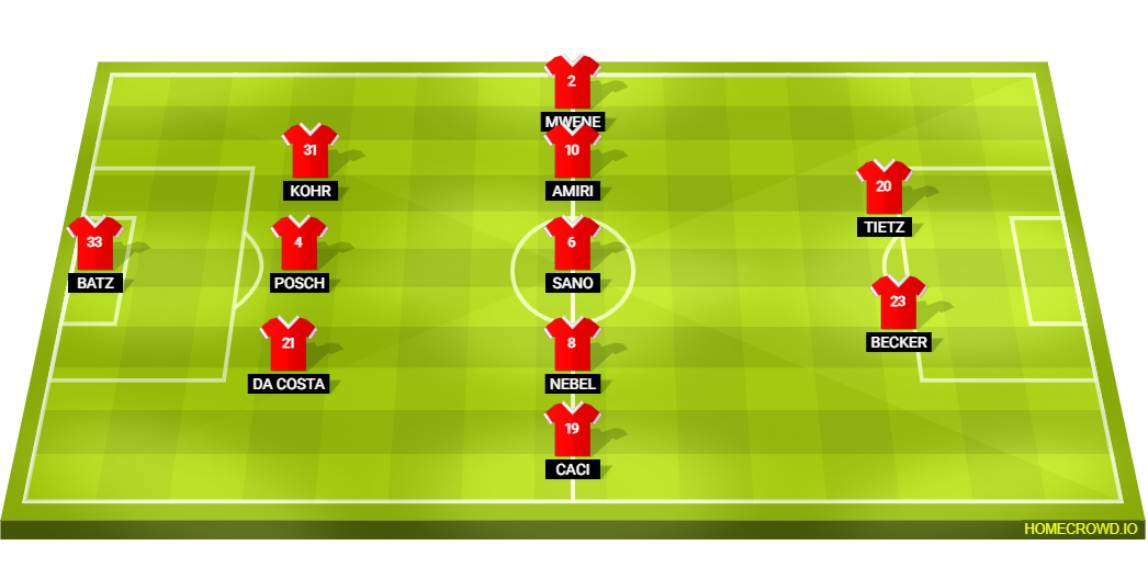 Probable Lineup (3-5-2): Batz; da Costa, Posch, Kohr; Caci, Nebel, Sano, Amiri, Mwene; Becker, Tietz