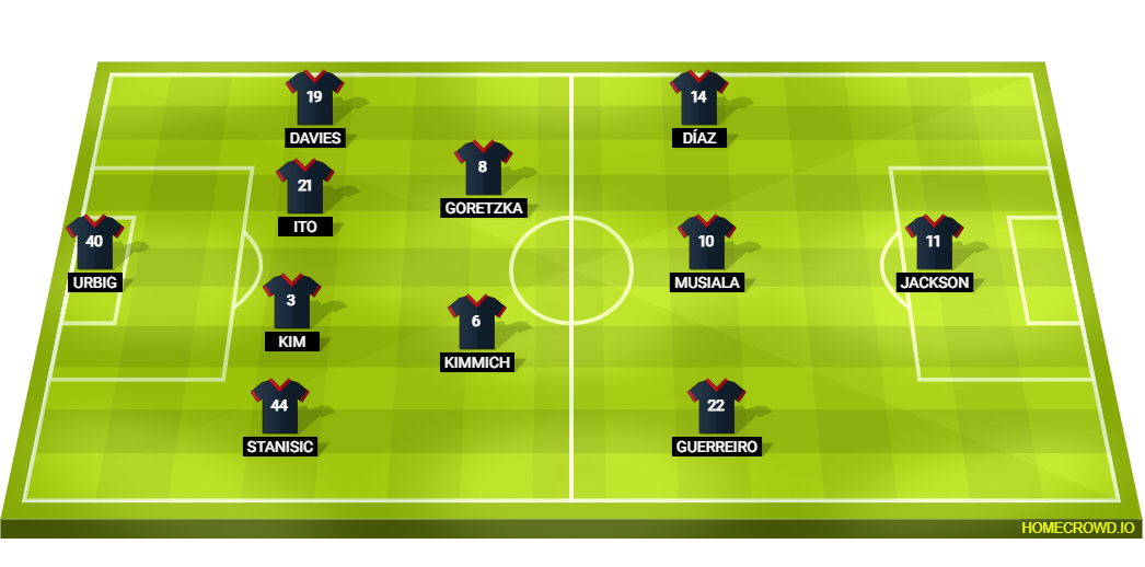 Probable Lineup (4-2-3-1): Urbig; Stanisic, Kim, Ito, Davies; Kimmich, Goretzka; Guerreiro, Musiala, Diaz; Jackson