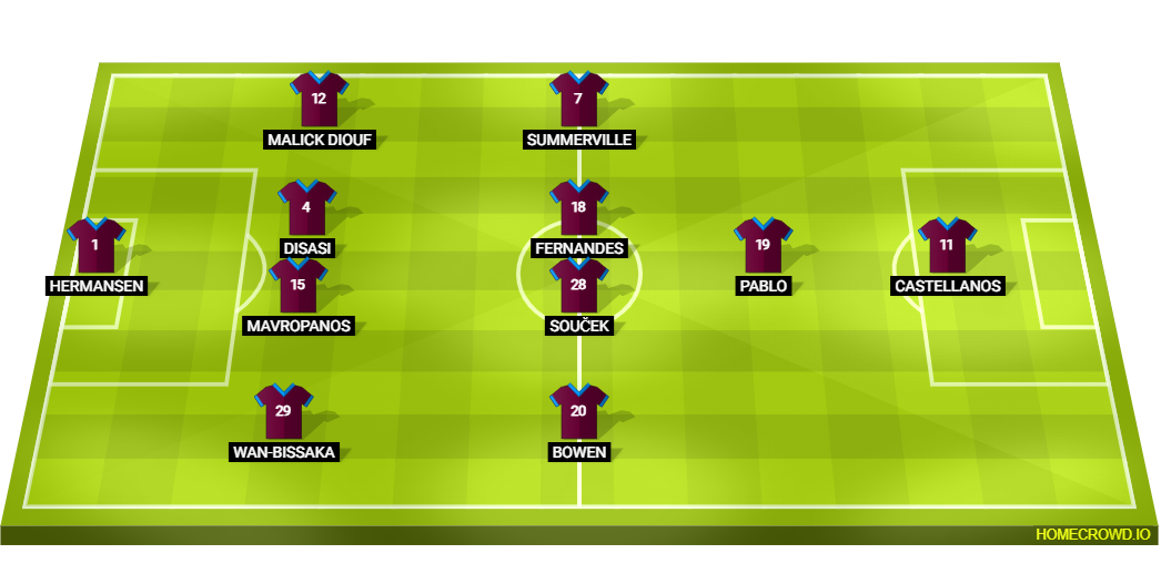 Probable Lineup (4-4-1-1): Hermansen; Wan-Bissaka, Mavropanos, Disasi, Diouf; Bowen, Soucek, Fernandes, Summerville; Pablo; Castellanos