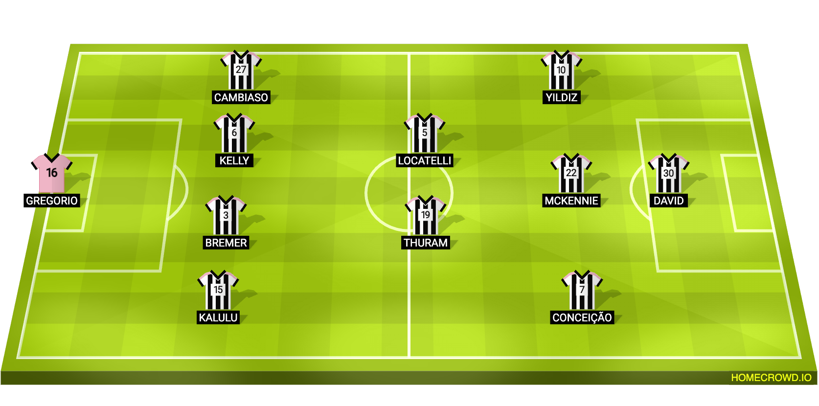 Probable Lineup (4-2-3-1): Di Gregorio; Kalulu, Bremer, Kelly, Cambiaso; Thuram, Locatelli; Conceicao, McKennie, Yildiz; David