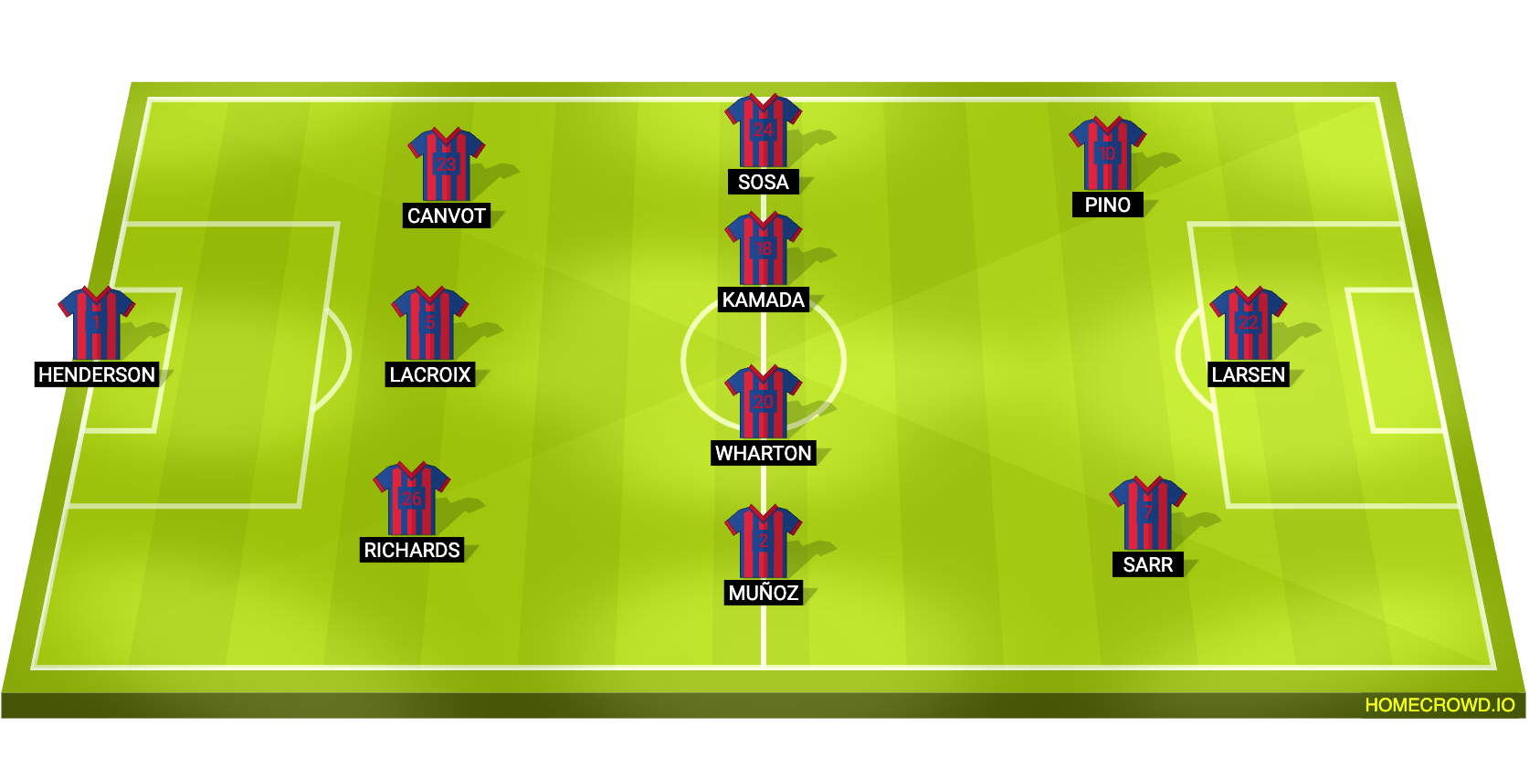 Probable Lineup (3-4-2-1): Henderson; Richards, Lacroix, Canvot; Munoz, Wharton, Kamada, Sosa; Sarr, Pino; Strand Larsen