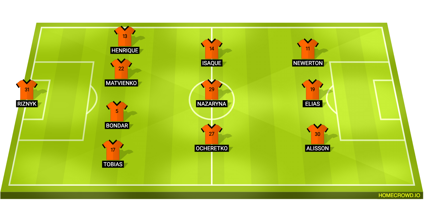 Probable Lineup (4-3-3): Riznyk; Tobias, Bondar, Matviienko, Henrique; Ocheretko, Nazaryna, Isaque; Alisson, K. Elias, Newerton