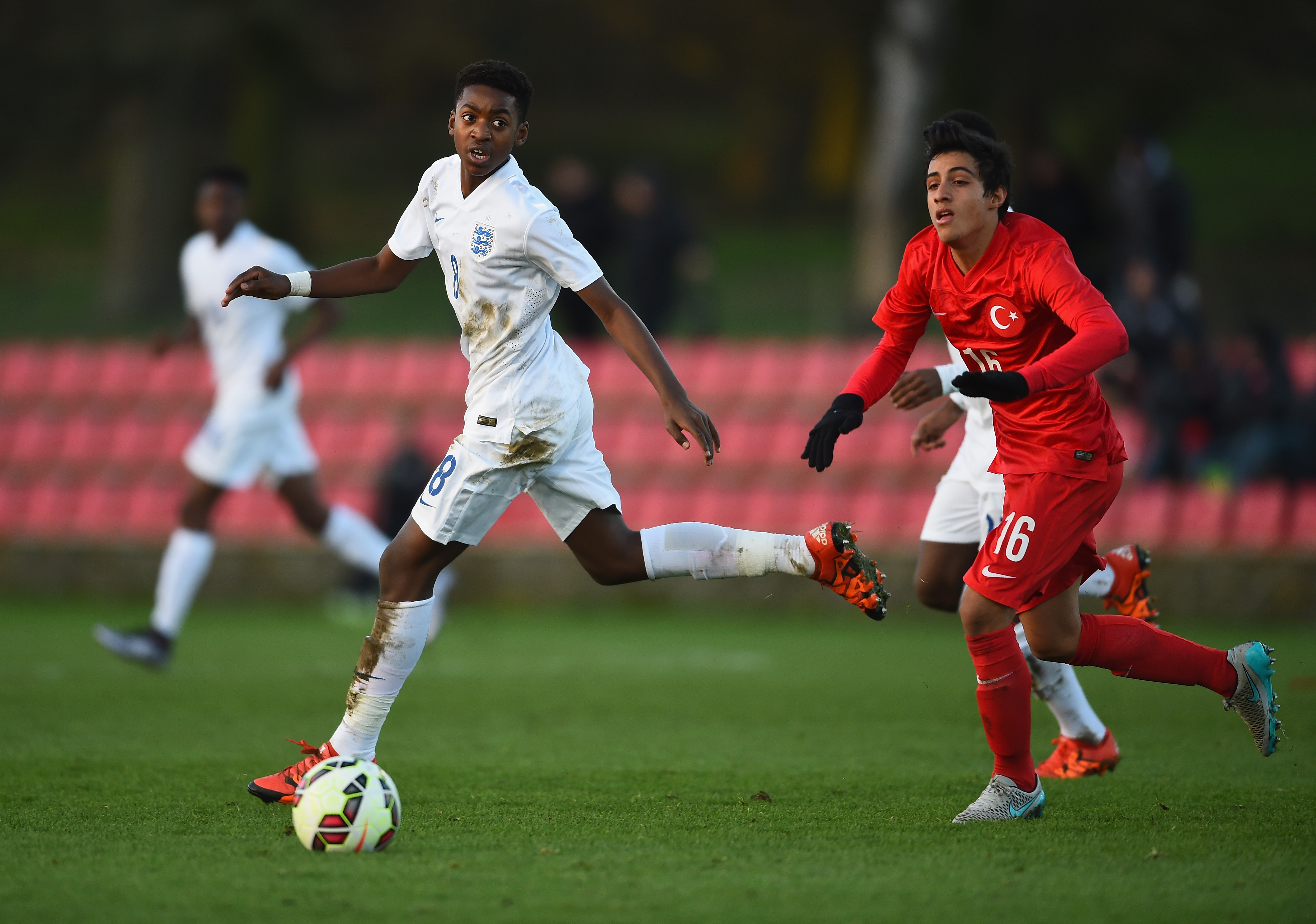 BURTON-UPON-TRENT, ENGLAND - DECEMBER 21:  Paris Maghoma of England battles with Serkan Bakan of Turkey during the International Friendly match between England U15 and Turkey U15 at St George's Park on December 21, 2015 in Burton-upon-Trent, England.  (Photo by Laurence Griffiths/Getty Images)